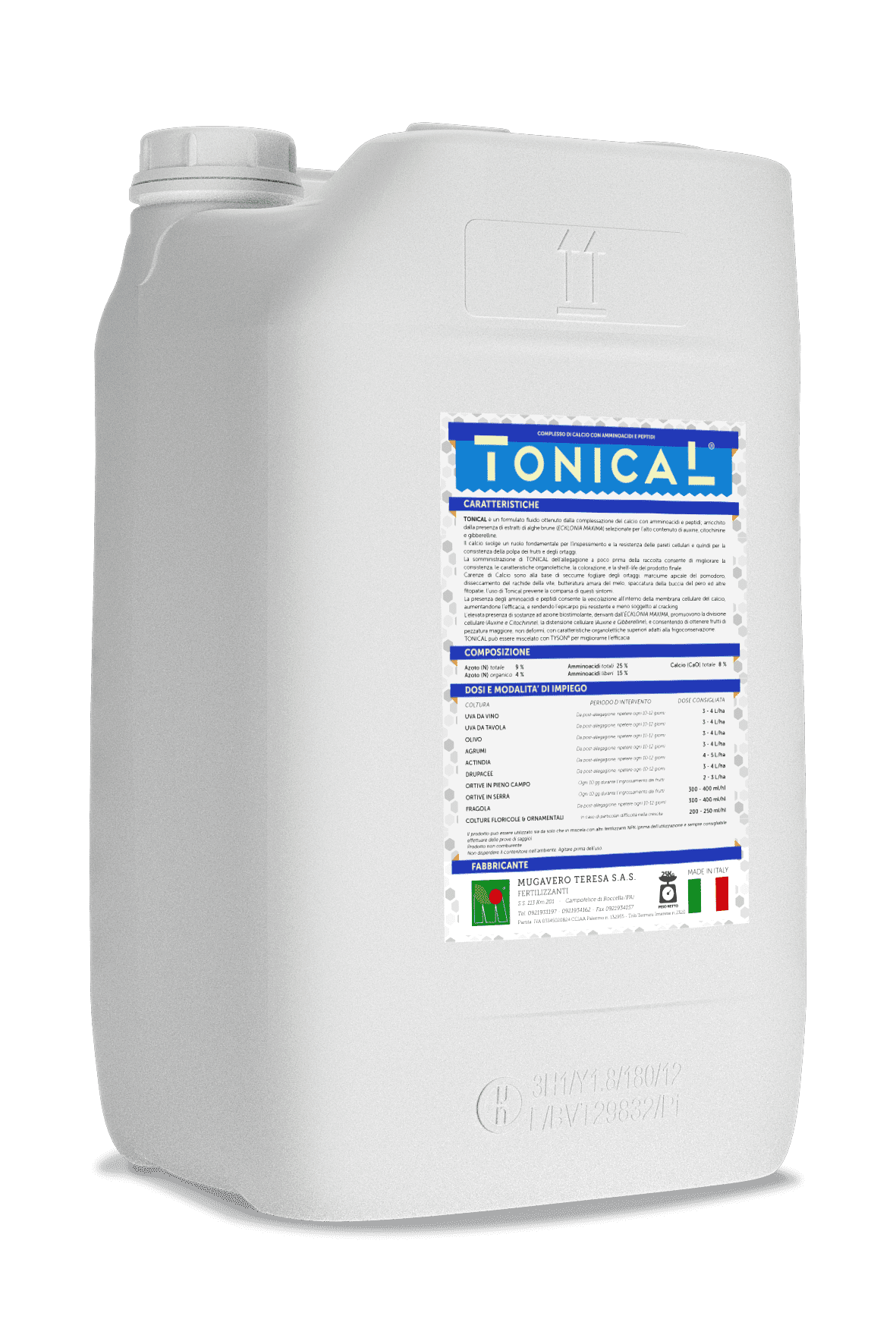 TONICAL это жидкая смесь, образуемая из смешения кальция с аминокислотами и пептидами, обогащенная экстрактом бурых водорослей, выбраных из-за высокого содержания ауксинов (11 мг/л), цитокининов (0,03 мг/л), и гиббереллинов.